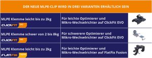 Heute werden wir den MLPE Klemmen für ClickFit EVO und FlatFix Fusion einführen. MLPE steht für Module-Level Power Electronics, was Optimierer und Mikro-Wechselrichter umfasst.