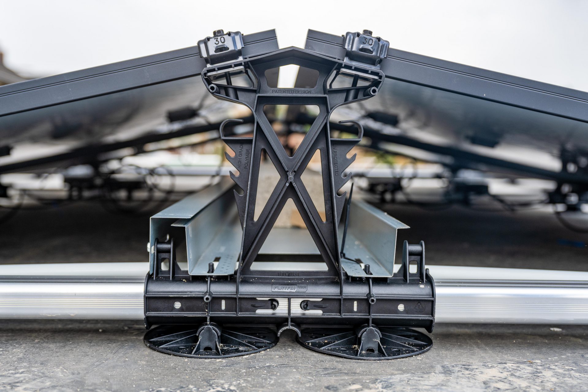 Einer der Hauptvorteile von FlatFix Fusion ist, dass die Montagerahmen vollständig modular sind. Dies bietet eine einzigartige Flexibilität bei der Gestaltung des Gebäudeplans, da die Module sowohl in der Länge als auch in der Breite miteinander verbunden werden können. Sie können die Reihenlängen und die Ausrichtung der Solarmodule auf der Grundlage ihrer Positionierung, der Dachform und der verfügbaren Dachfläche bestimmen und Hindernisse problemlos umbauen.