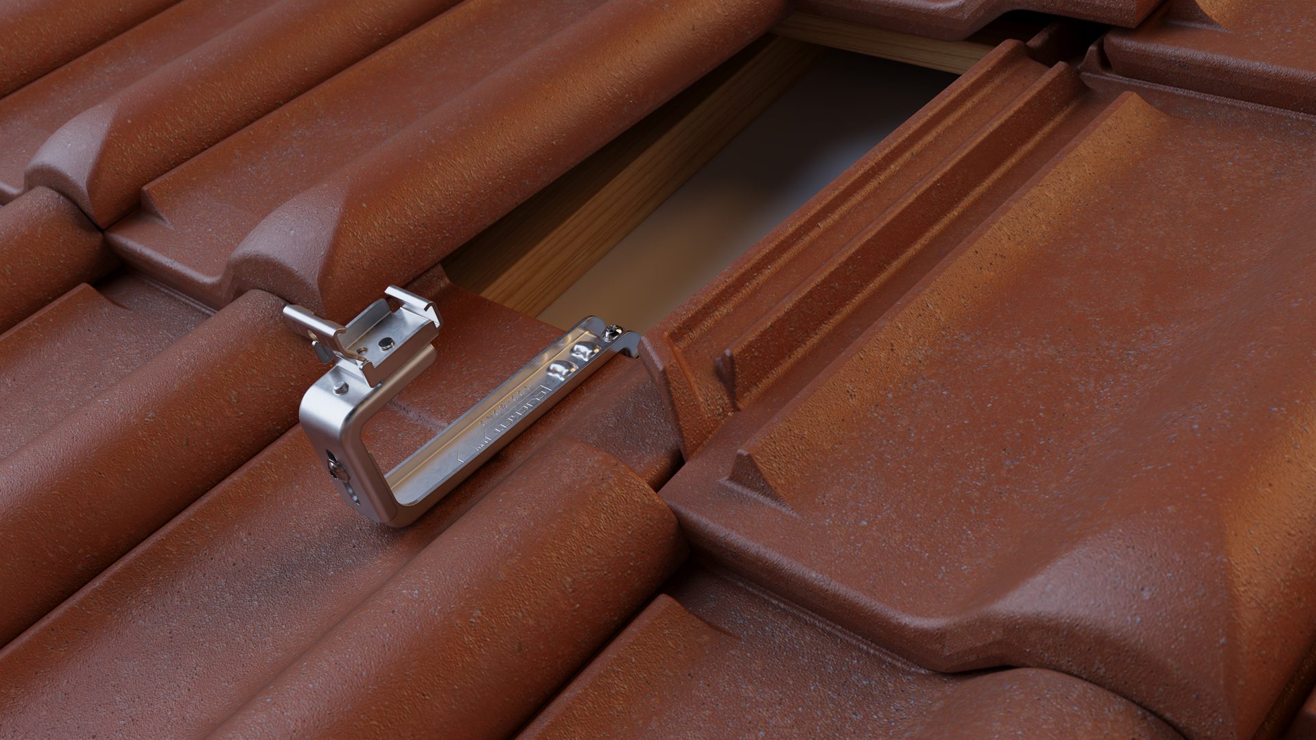 The ClickFit EVO Roof hook Pro is specially designed for extra strength. By securely screwing it onto the rafter and maintaining a gap between the tile and hook, it can withstand higher snow and wind loads.