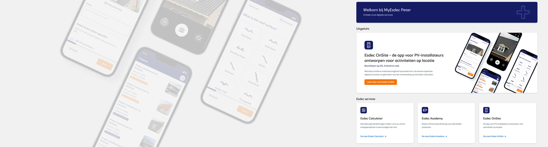 Building value for solar professionals. Vanuit die ambitie lanceren wij MyEsdec op ’s werelds meest toonaangevende vakbeurs Intersolar (München, 19-21 juni). MyEsdec is dé nieuwe online portal waarmee gebruikers met één account toegang hebben tot al onze digitale tools en services. Eén van die tools is Esdec OnSite, een app die installateurs ondersteunt bij het werk op locatie.