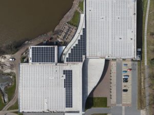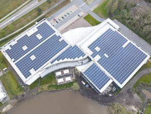 Het dak van Fun en Entertainment Center Sevenum is voorzien van een zonnesysteem met een totaal vermogen van 883.500 Wp. De 1904 zonnepanelen van Jinko Solar en omvormers van SMA zijn geïnstalleerd met behulp van Esdec’s FlatFix Wave Plus