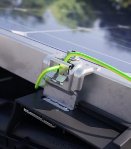 Para evitar diferenças de tensão no sistema fotovoltaico, utiliza-se a equalização potencial para ligar todas as partes que possam ter corrente. Para a ligação de todos os módulos fotovoltaicos numa fileira utiliza-se o grampo de módulo universal FlatFix Fusion. Previamente, para ligar os módulos fotovoltaicos um com o outro, o FlatFix Fusion utiliza sempre anéis de ligação à terra debaixo dos módulos. Este anel de ligação à terra foi substituído pelo grampo de módulo universal. Graças ao novo grampo de módulo universal, esse passo está integrado na instalação de grampos, sem necessitar qualquer manuseamento ou peça adicional. Os cantos afiados dos anéis de ligação à terra e/ou os terminais de ligação cortam a camada externa dura (por exemplo, oxidação, anodização ou pintura) da estrutura do módulo fotovoltaico, obtendo-se uma ligação elétrica robusta e duradoura. Com a colocação do grampo de módulo universal, todos os módulos fotovoltaicos numa fileira são imediatamente “ligados” uns aos outros. Para continuar a ligação permanente à terra, utiliza-se o cabo de ligação à terra multi-core de 6mm2 de cobre estanhado, ligado à calha de ligação à terra através do clipe de ligação à terra encaixado no grampo terminal.